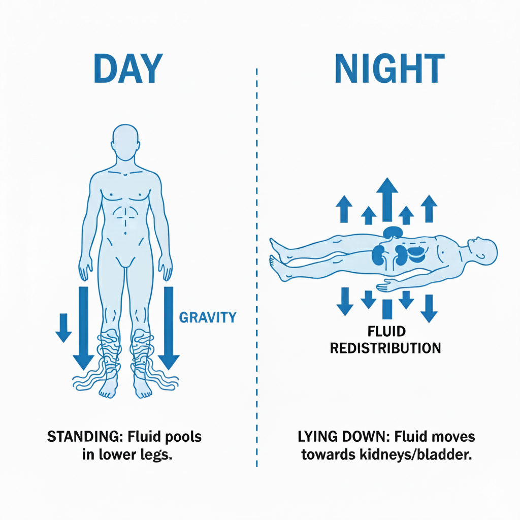 Researchers measured leg fluid volume during the day. Those with the highest daytime fluid retention had the most severe nocturia—up to 6 bathroom trips per night.